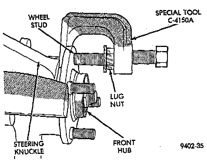 7. Install a lug nut on wheel stud to be removed from hub and bearing assembly, so threads on stud are even with end of lug nut. Rotate hub so stud requiring removal is aligned with notch cast into front of steering knuckle. Install Remover, Special Tool C-4150, or equivalent on hub and bearing assembly flange and wheel stud.