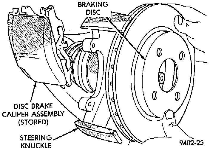 4. Remove disc brake caliper assembly from steering knuckle. Caliper is removed by first lifting bottom of caliper away from steering knuckle, and then removing top of caliper out from under steering knuckle.