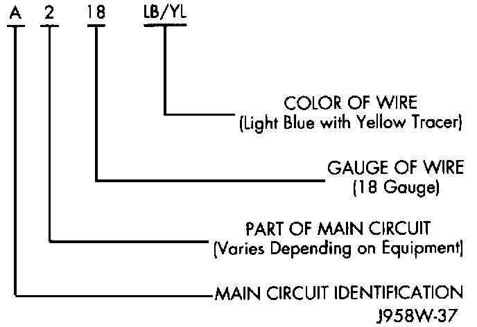 Each wire shown in the diagrams contains a code which identifies the main circuit, part of the main circuit, gauge of wire and color. The color is shown as a two-letter code, which can be identified by referring to the Wire Color Code chart. If the wire has a tracer and it is a standard color, an asterisk will follow the main wire color. If the tracer is non-standard, the main wire color will have a slash (/) after it, followed by the tracer color.