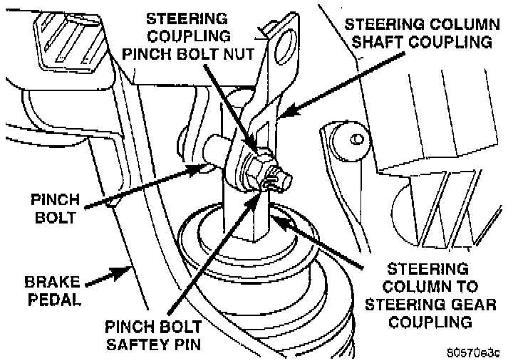 1. Remove the pinch bolt safety pin from the steering column shaft coupling pinch bolt.