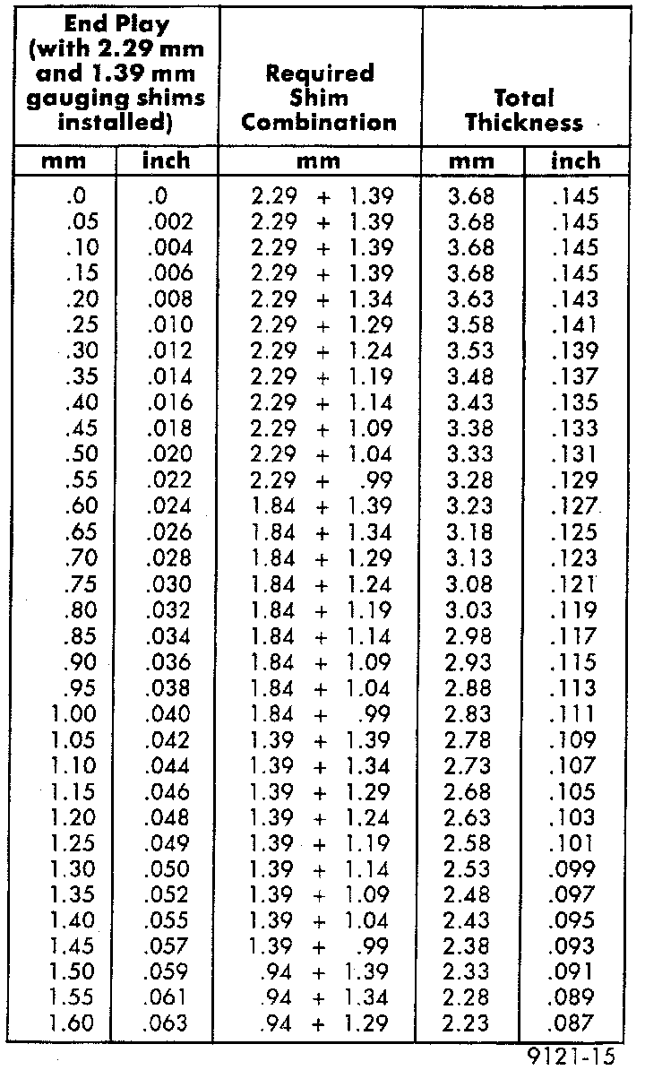 NOTE: If end play is too high, install a 0.05 mm (0.002 inch) thinner shim combination. If end play is too low, install a 0.05 mm (0.002 inch) thicker shim combination. Repeat until 0.05 to 0.25 mm (0.002 to 0.010 inch) end play is obtained