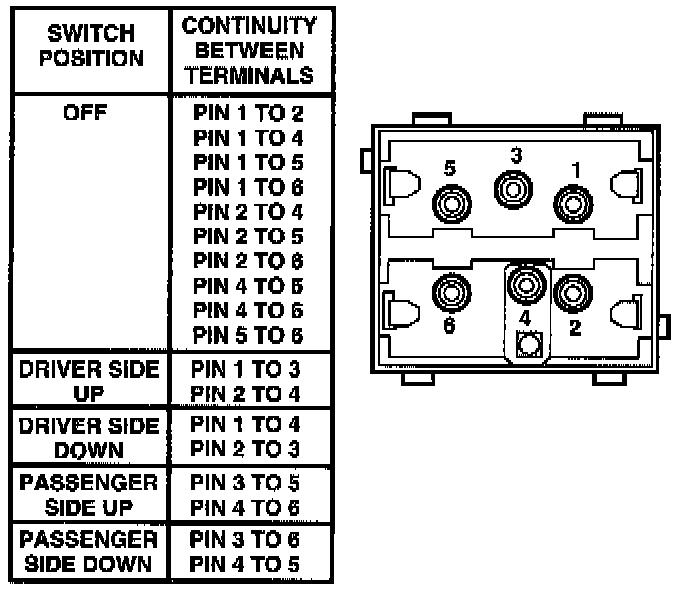 Remove the switch from its mounting, refer to the Window Switch Removal and Installation procedures. Using an ohmmeter, refer to the test procedure, Driver Side or Passenger Side Window Switch Continuity Test to determine if continuity is correct. If the results are not obtained, replace the switch.
