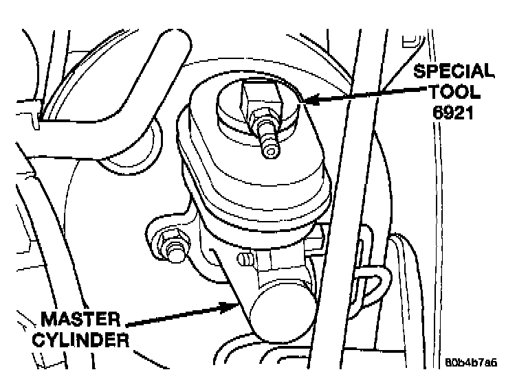2. Install the Adapter Master Cylinder Pressure Bleed Cap, Special Tool 6921, on the fluid reservoir of the master cylinder. Attach the fluid hose from the pressure bleeder to the fitting on Special Tool 6921.