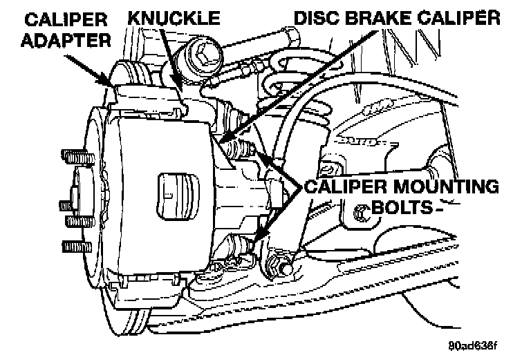 5. Remove disc brake caliper from caliper adapter. Caliper is removed by first rotating the free end of the caliper away from the caliper adapter.