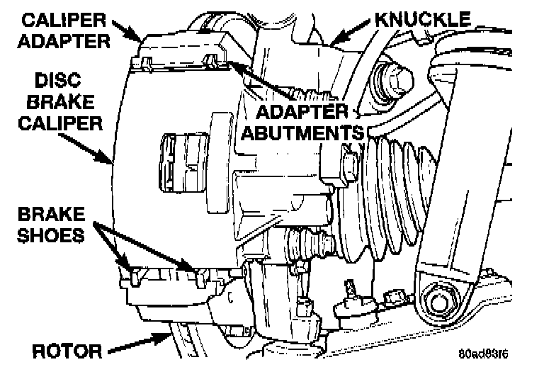The caliper adapter is mounted to the rear knuckle between the knuckle and the hub/bearing. The caliper adapter mounts the rear disc brake caliper to the knuckle and is used to mount the parking brake shoes and actuating cables to the vehicle. The caliper adapter has two machined abutments which are used to position and align the caliper and brake shoes for inboard and outboard movement of the caliper.