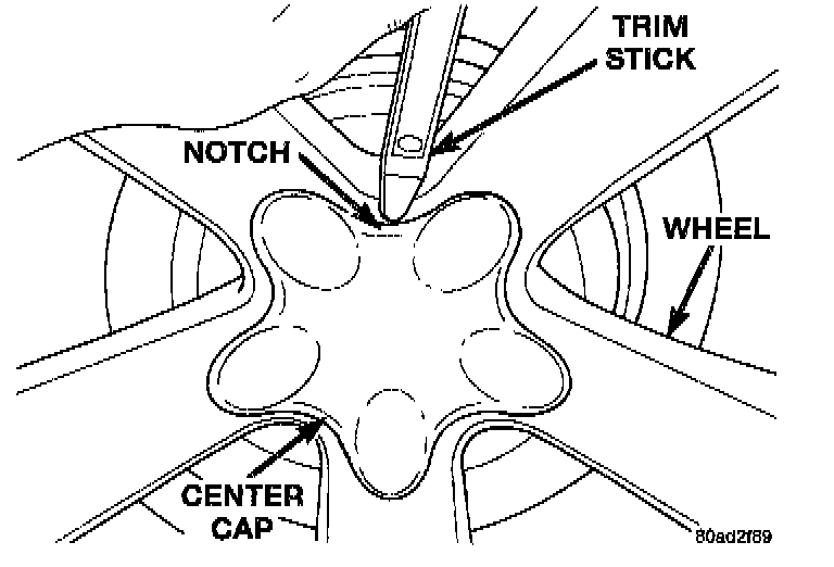 2. Remove the center cap from the wheel. Center cap is removed by inserting a trim stick into the notch on the center cap and prying it off the wheel.