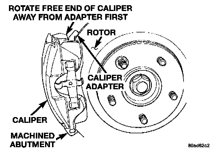 5. Remove the disc brake caliper from the caliper adapter. Caliper is removed by first rotating the free end of the caliper away from the caliper adapter. Then with the free end of the caliper rotated away from the adapter, lift the caliper off the machined abutment on the adapter.