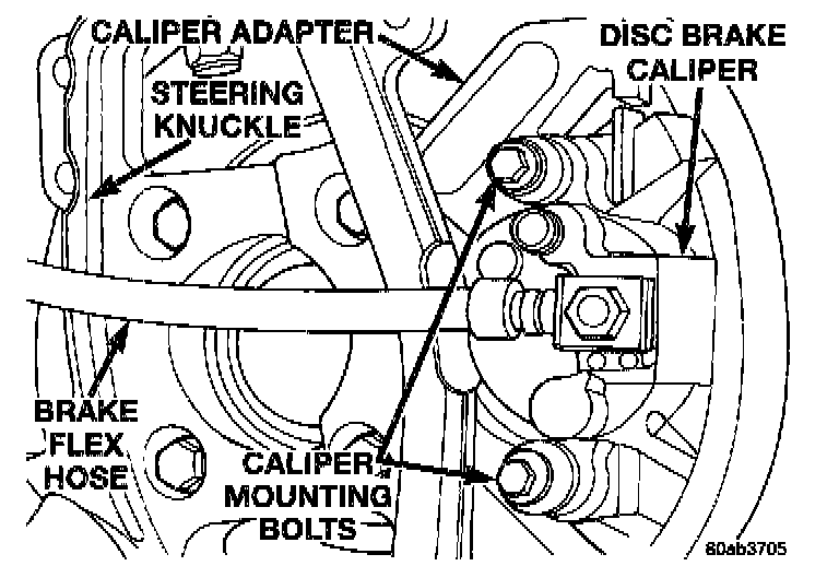 4. Remove the 2 bolts attaching the brake caliper to the caliper adapter.