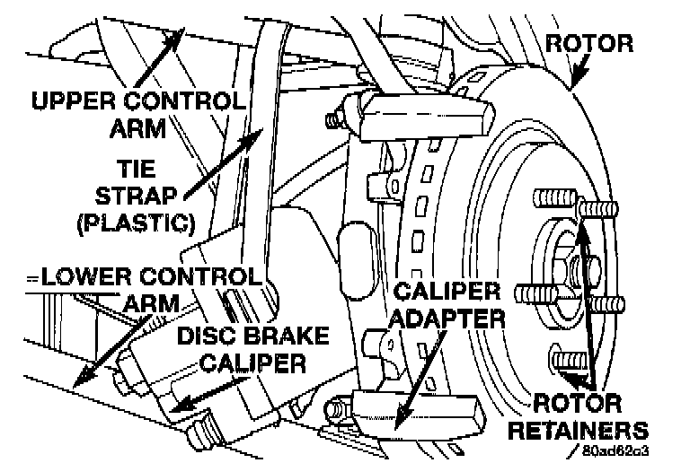 Note: The upper control arm on this vehicle has a clearcoat finish applied to it. When hanging the disc brake caliper from the control arm do not use wire or any similar material that would damage the clearcoat finish. A plastic tie strap is a suitable method of supporting the disc brake caliper.