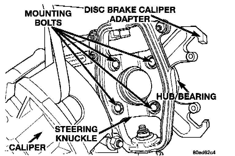 8. Remove the 4 bolts mounting the hub/ bearing and the caliper adapter to the steering knuckle