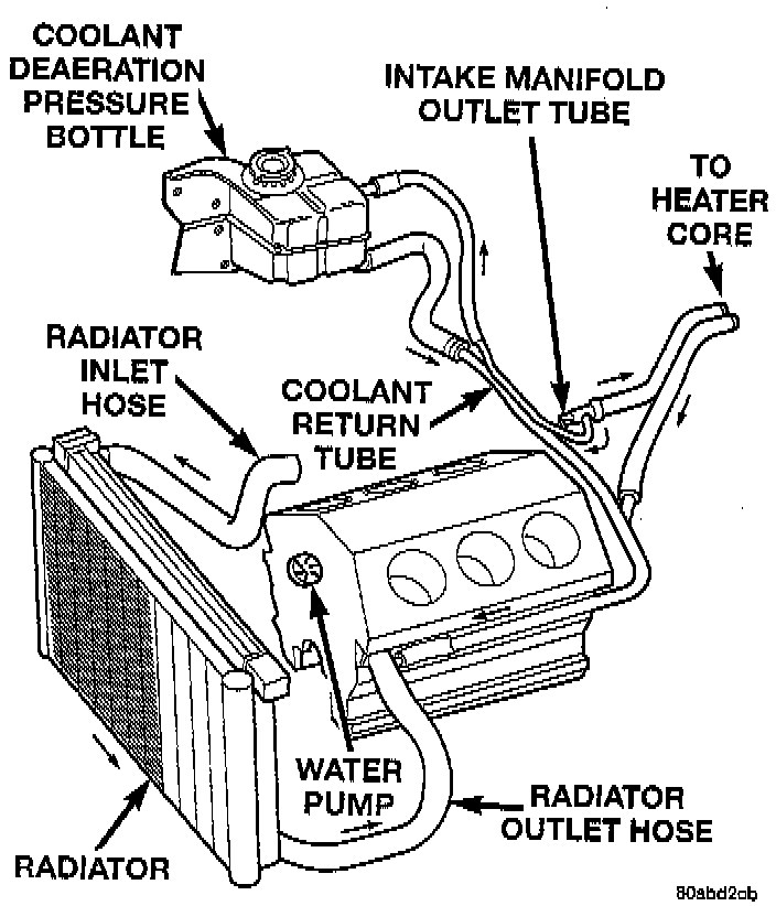The cooling system consists of an engine cooling module, pressure cap, coolant bottle, thermostat, coolant, and a water pump to circulate the coolant. The engine cooling module consist of a radiator, electric fan motors, shroud, internal transmission oil cooler, air conditioning condenser, receiver drier, and a auxiliary transmission oil cooler (if equipped).