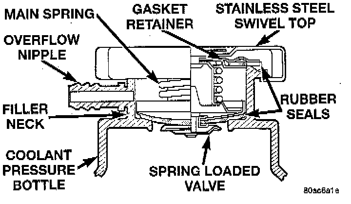 The pressure cap upper gasket (seal) pressure relief can be checked by removing cap. Attach the Radiator Pressure Tool to the cap and pump air into the cap. Pressure cap upper gasket should relieve at 124 kPa (18 psi) and hold pressure at 110 kPa (16 psi) minimum.