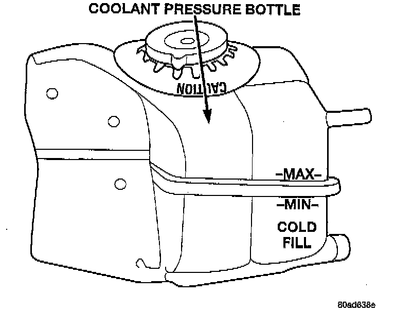 Do not remove coolant bottle pressure cap for routine coolant level inspections. The coolant bottle provides a quick visual method for determining the coolant level without removing the pressure cap. With the engine cold and not running the level of the coolant in the coolant bottle should be between MIN and MAX level marks.