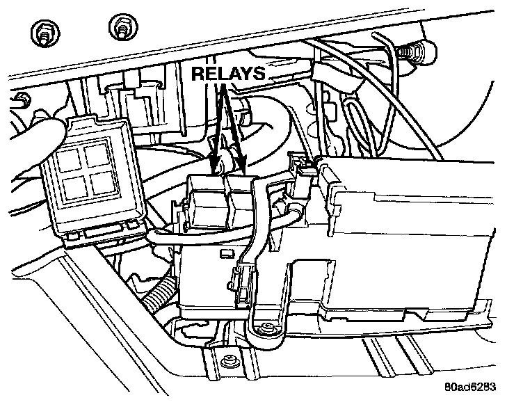 The A/C compressor clutch relay is located in the Power Distribution Center (PDC) near the battery. A decal on the inside of the PDC covers shows the locations of each relay and fuse contained in the PDC.
