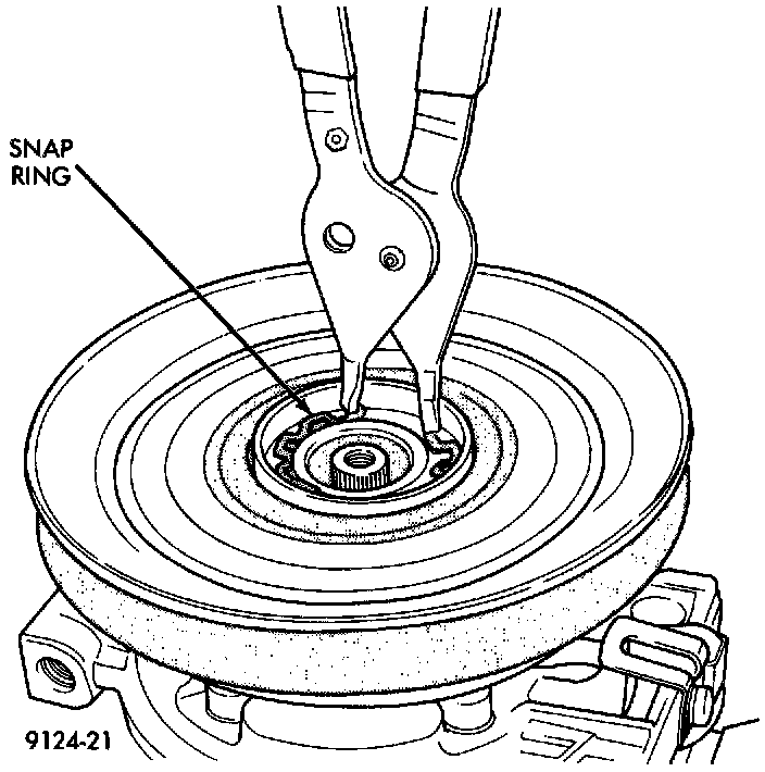 4. Install pulley assembly retaining snap ring (bevel side outward) with Snap Ring Pliers (C-4574). Press the snap ring to make sure it is properly seated in the groove.