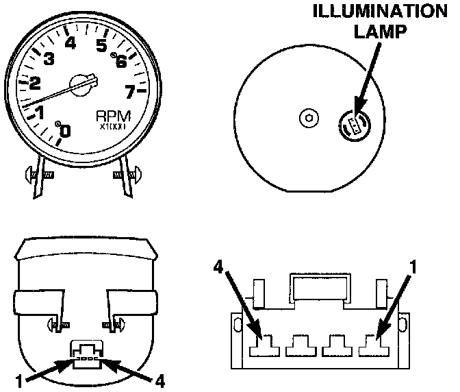 5. With the engine running check Pin 1 for a pulse signal. The engine speed produces 3 pulses per revolution. Example: 1,000 rpm is approximately 50 pulses per second. A voltage reading of 3 volts will show that a pulse is being send to the tachometer. If OK, replace tachometer. If not OK, check wire circuit from the PCM.