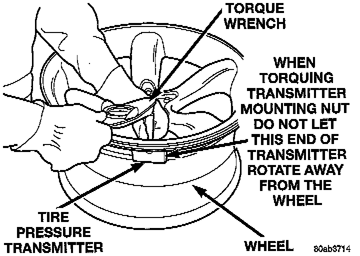 2. Tighten the tire pressure transmitter mounting nut to a torque of 9 Nm (80 inch lbs.). When torquing the tire pressure transmitter, hold the transmitter so it does not rotate. If the transmitter rotates so the top edge is not level with the wheel, damage to the transmitter will occur when mounting the tire. If the top edge of the transmitter is not level with the wheel it can be rotated into position by lightly tapping it with your hand.