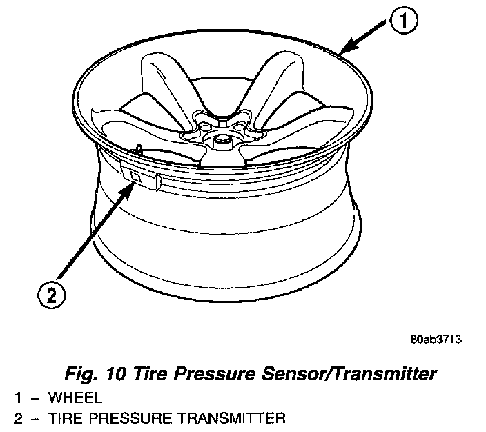 9. Verify that the receiver has been programmed with the identification code from the new tire pressure transmitter. Use the DRB III scan tool to look at the receiver's memory for an identification code and the tire pressure thresholds value from the new tire pressure transmitter. If the identification code and tire pressure thresholds from the new tire pressure transmitter are present in the receivers memory the new tire pressure transmitter has been correctly programmed to the receiver.