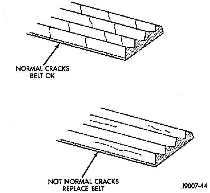 NOTE: V-Ribbed belt system with back drive pulley may develop minor cracks across the ribbed side (due to reverse bending). These minor cracks are considered normal and acceptable. Parallel cracks are not.