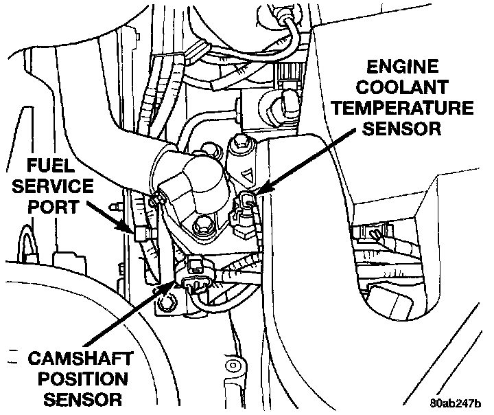 The engine coolant temperature sensor threads into the water jacket next to thermostat housing. The sensor provides an input to the Powertrain Control Module (PCM). As coolant temperature varies, the sensor resistance changes, resulting in a different input voltage to the PCM.