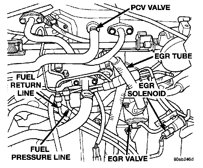 Fuel Return Line, PCV Valve, EGR Tube, EGR Solenoid, EGR Valve, Fuel Pressure Line: