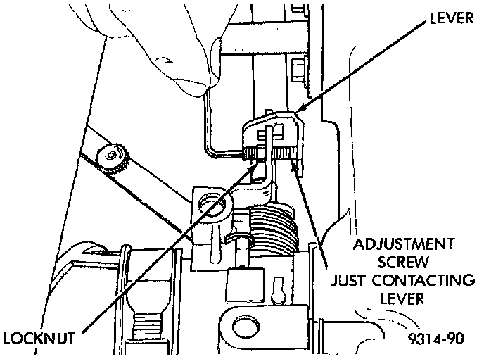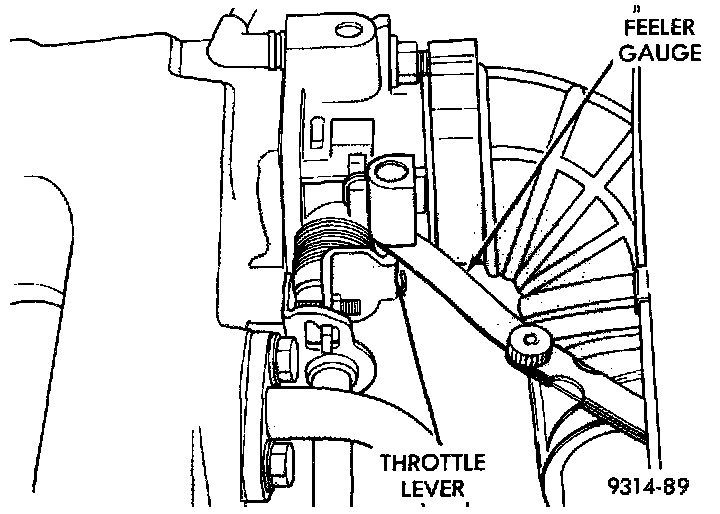 4. Check clearance between the throttle lever and the idle speed screw. The 0.004 inch feeler gauge should drag when removed. Also, a 0.006 inch feeler gauge should not fit between throttle lever and idle speed screw.