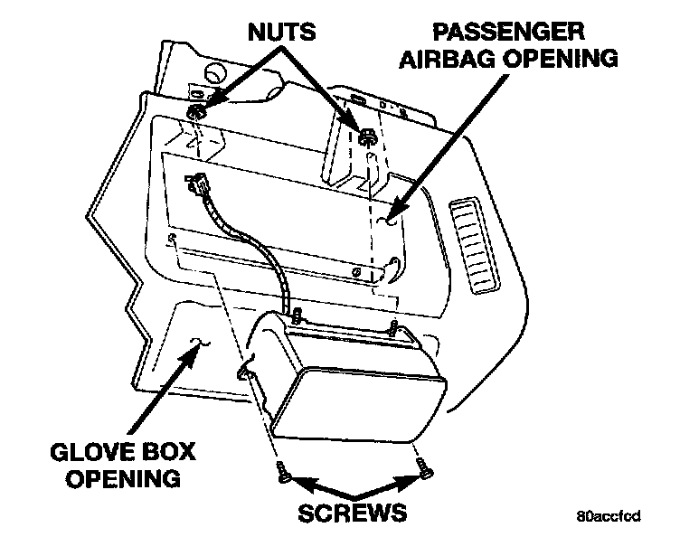 6. Remove the two screws attaching the Passenger Airbag Module through the glove opening. Remove the two nuts attaching the Passenger Airbag Module through the top cover access.