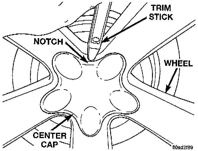 2. Remove the center cap from the wheel. Center cap is removed by inserting a trim stick into the notch on the center cap and prying it off the wheel.