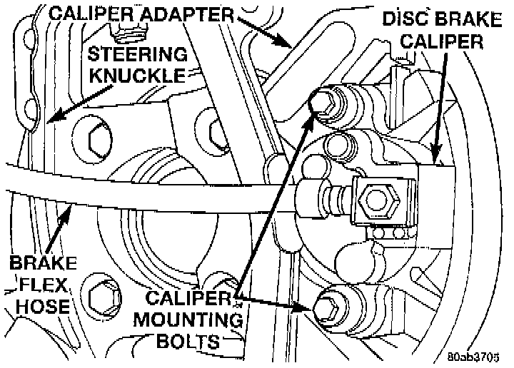 4. Remove the 2 bolts attaching the disc brake caliper to the caliper adapter.