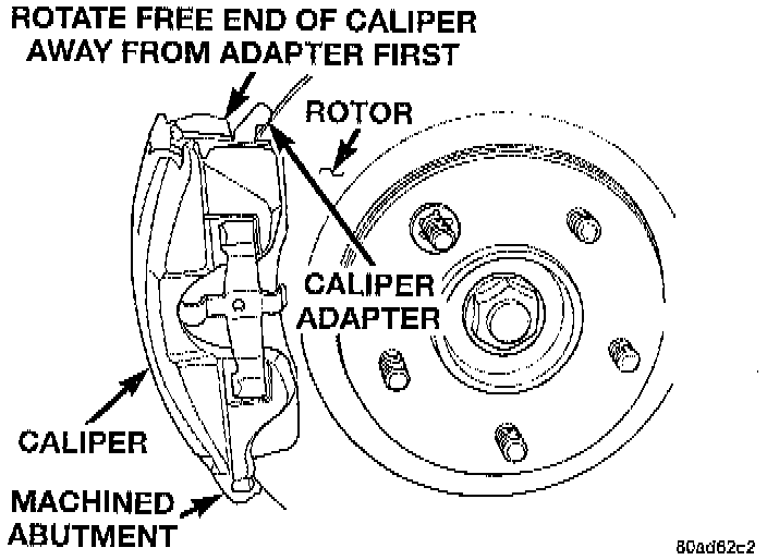 5. Remove the disc brake caliper from the caliper adapter. Caliper is removed by first rotating the flee end of the caliper away from the caliper adapter. Then with the free end of the caliper rotated away from the adapter, lift the caliper off the machined abutment on the adapter.