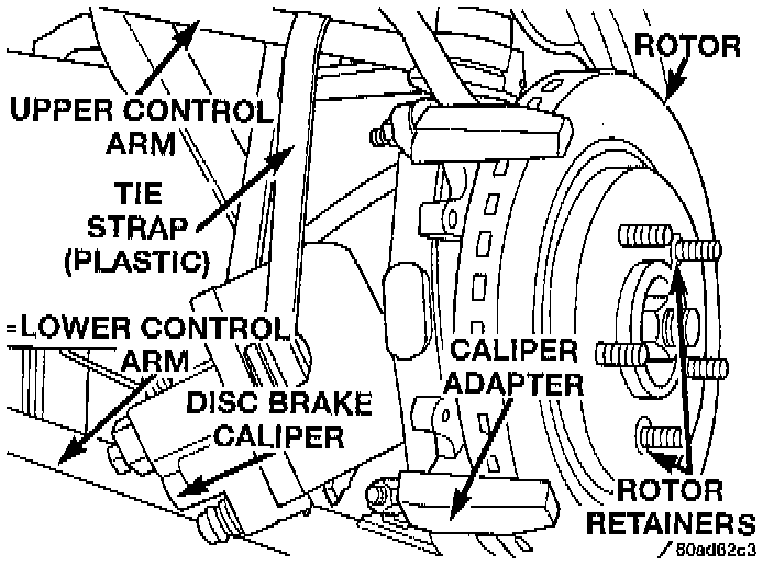 NOTE: The upper control arm on this vehicle has a clear-coat finish applied to it. When hanging the disc brake caliper from the control arm do not use wire or any similar material that would damage the clear-coat finish. A plastic tie strap as shown is a suitable method of supporting the disc brake caliper.