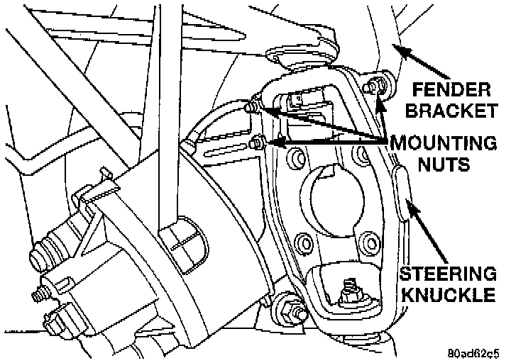 10. Remove the 3 nuts mounting the fender bracket to the steering knuckle. Remove the fender from the steering knuckle.