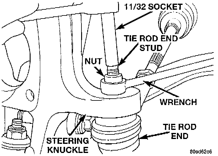 11. Remove the nut attaching the outer tie rod end to the steering knuckle. Nut is to be removed using the following procedure. Hold the tie rod end stud from rotating with a 11/32 socket while loosening and removing the nut with a wrench.