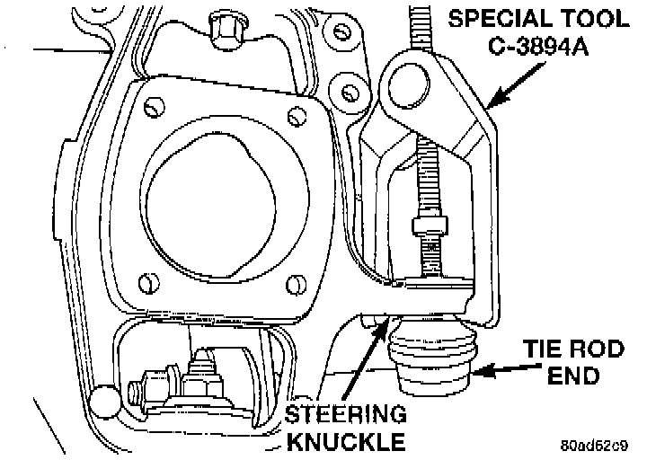 13. Remove the outer tie rod from the steering knuckle using Puller, Special Tool C-3894-A, or equivalent.