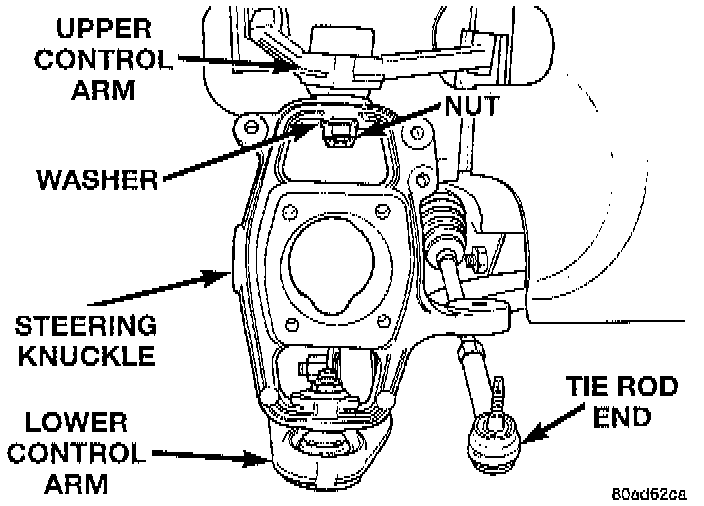 14. Remove the nut and washer from the stud of the upper ball joint.
