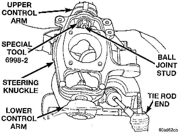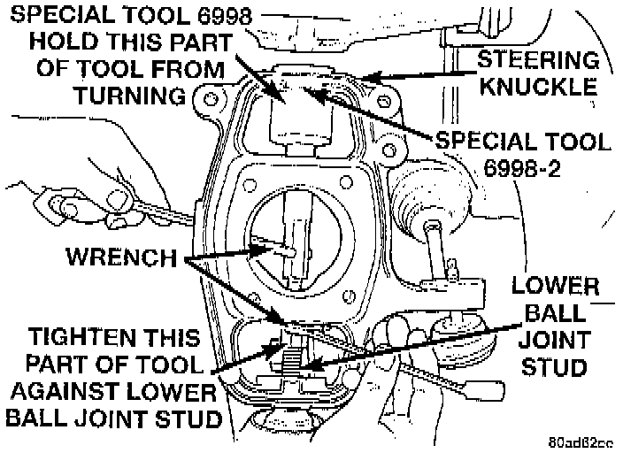 18. Using a wrench, keep the section of special tool 6998, or equivalent that is against Special Tool 6998-2, or equivalent from rotating. Using a wrench, tighten the threaded end of Remover, Special Tool 6998, or equivalent against the stud of the lower ball joint. This will press the lower ball joint stud out of the steering knuckle.