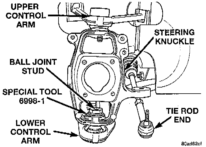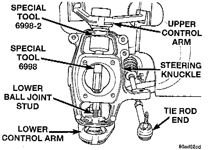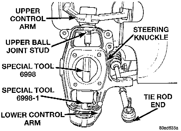 23. Remove the Remover, Special Tool 6998, or equivalent from the steering knuckle. Remove the Nut, Special Tool 6998-1, or equivalent from the upper ball joint stud.