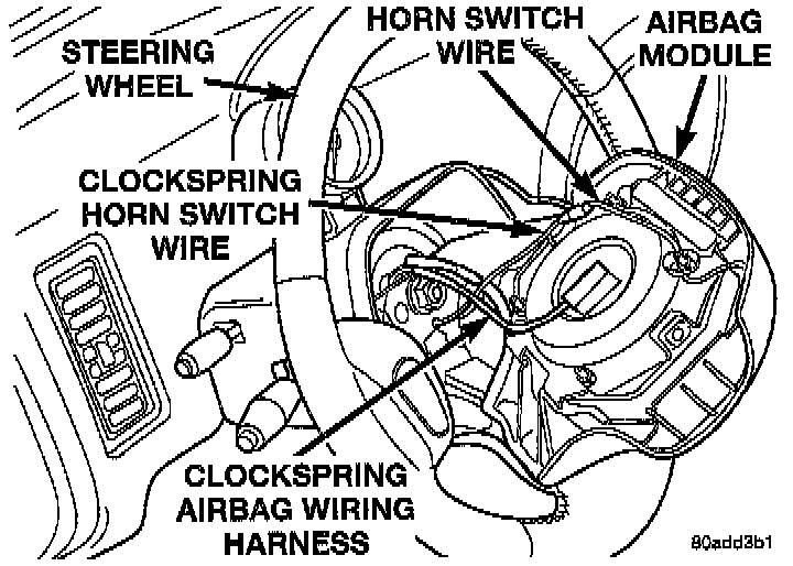 5. Disconnect airbag wiring harness connector from clockspring at airbag module. Then disconnect wiring lead for horn switch in airbag module from clockspring wiring lead.