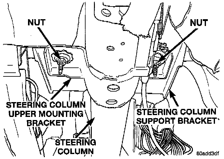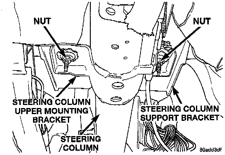 12. Loosen the 2 nuts mounting the steering column upper mounting bracket to the steering column support bracket studs. Thread nuts down to the end of the studs.