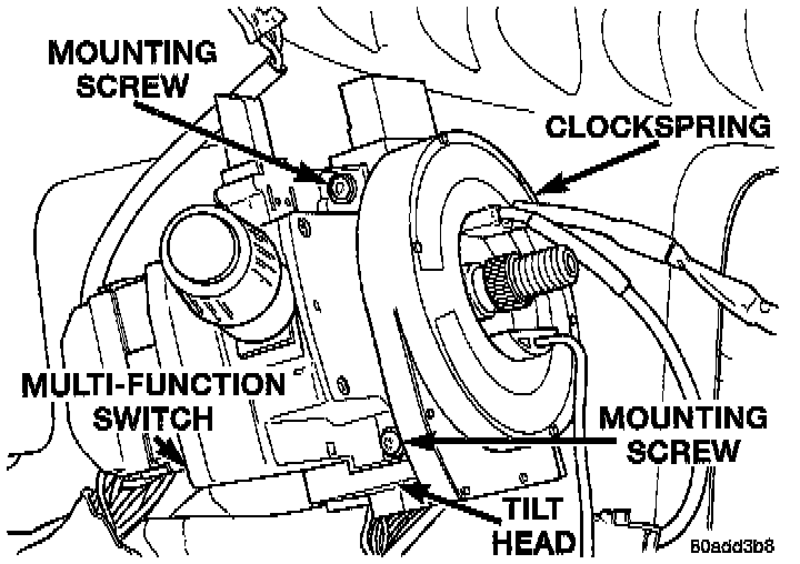 16. Remove the 2 screws mounting the multi-function switch to the tilt head on the steering column. Remove multi-function switch, with wiring harness attached, from steering column