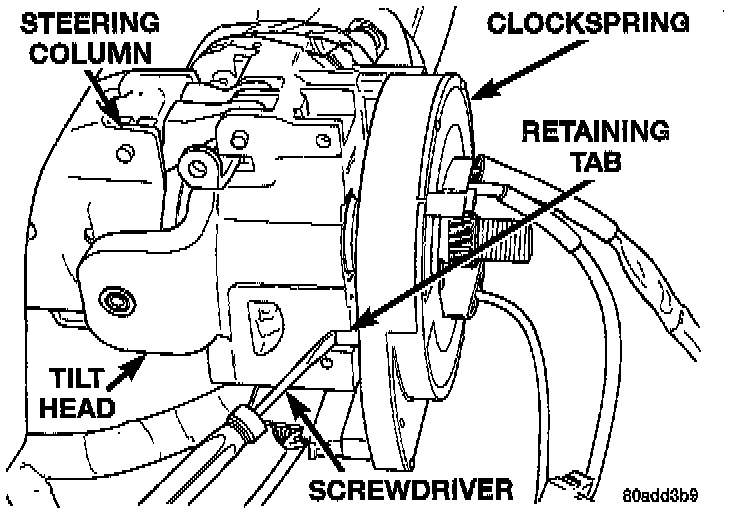 17. Using a screwdriver release retaining tab locking clockspring to tilt head on steering column. Then remove clockspring, with wiring harness attached, from steering column tilt head.