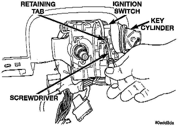 18. Remove key cylinder from ignition switch. Key cylinder is removed using the following procedure. Rotate the key cylinder to the on position. Using a small screwdriver press in the key cylinder retaining tab. While holding retaining tab in with screwdriver, pull the lock cylinder out of ignition switch.