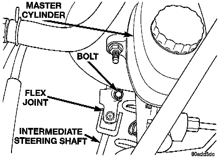 20. Remove intermediate steering shaft flex joint from steering column shaft. Flex joint is removed using following procedure. Remove bolt from flex joint on intermediate steering shaft. Then slide flex joint off the end of the steering column shaft.