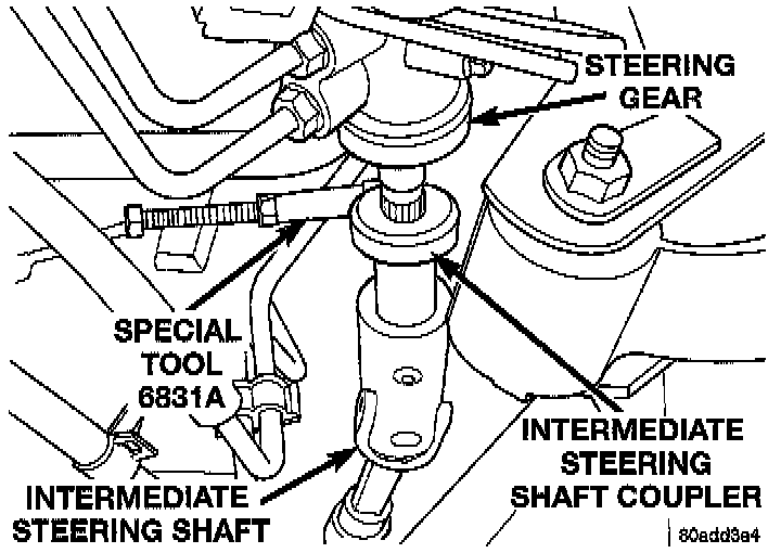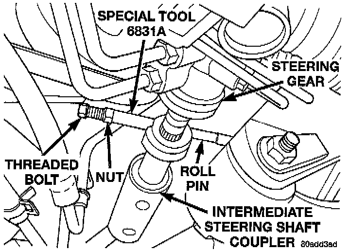 3. Remove roll pin from intermediate steering shaft coupler using the following procedure. Using a wrench, hold threaded bolt on Remover, Roll Pin, Special Tool 6831A, or equivalent from rotating. Using a second wrench, tighten nut against sleeve of special tool. This will pull the roll pin out of the coupler on the intermediate steering shaft.