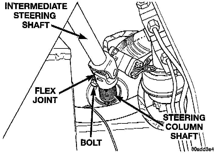 5. Remove intermediate steering shaft flex joint from steering column shaft. Flex joint is removed using following procedure. Remove bolt from flex joint on intermediate steering shaft. Then slide flex joint off the end of the steering column shaft.