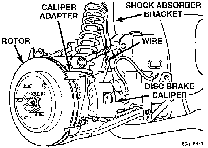 7. Support the disc brake caliper by hanging it from the shock absorber bracket on the frame using wire or a tie strap. Do not let the flex hose support the weight of the brake caliper, damage to the flex hose can occur.