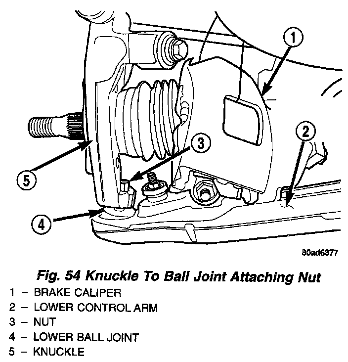 16. Remove the nut and washer mounting the knuckle to the stud of the lower ball joint.