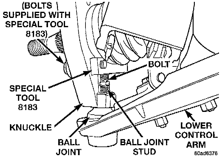 19. Remove the lower ball joint from the knuckle. The stud is removed from the knuckle using Remover, Special Tool 8183, or equivalent and the following procedure. Bolt special tool on the real of the knuckle 8183, or equivalent. Special Tool 8183, or equivalent is bolted to the knuckle through the hub/bearing to knuckle bolt holes rising the bolts that are supplied with Special Tool 8183, or equivalent. Tighten the bolt on Special Tool 8183, or equivalent against the stud of the lower ball joint until the stud is pressed out of the knuckle.