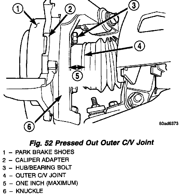 CAUTION: When pressing the stub shaft out of the hub/bearing, do not exceed the distance of one inch from rear surface of the knuckle. If the stub shaft is pressed back further the driveshaft joints can be damaged.