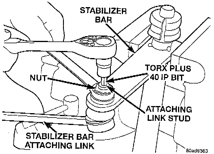 3. Install stabilizer bar attaching link so the attaching link stud is on the same side of the stabilizer bar as the bushing. Install the nut on the attaching link stud. Use the same procedure as removing it to keep the stud from rotating.